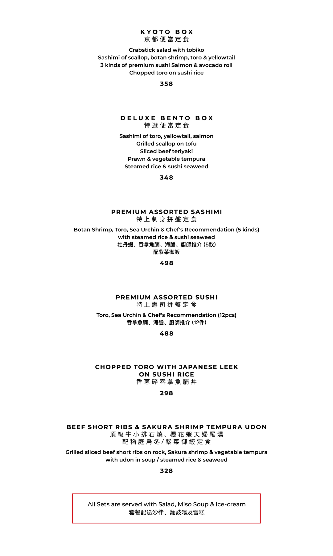 Feeling classic? Kyoto Bento and Premium Sashimi Sets are on the menu for all the purists.