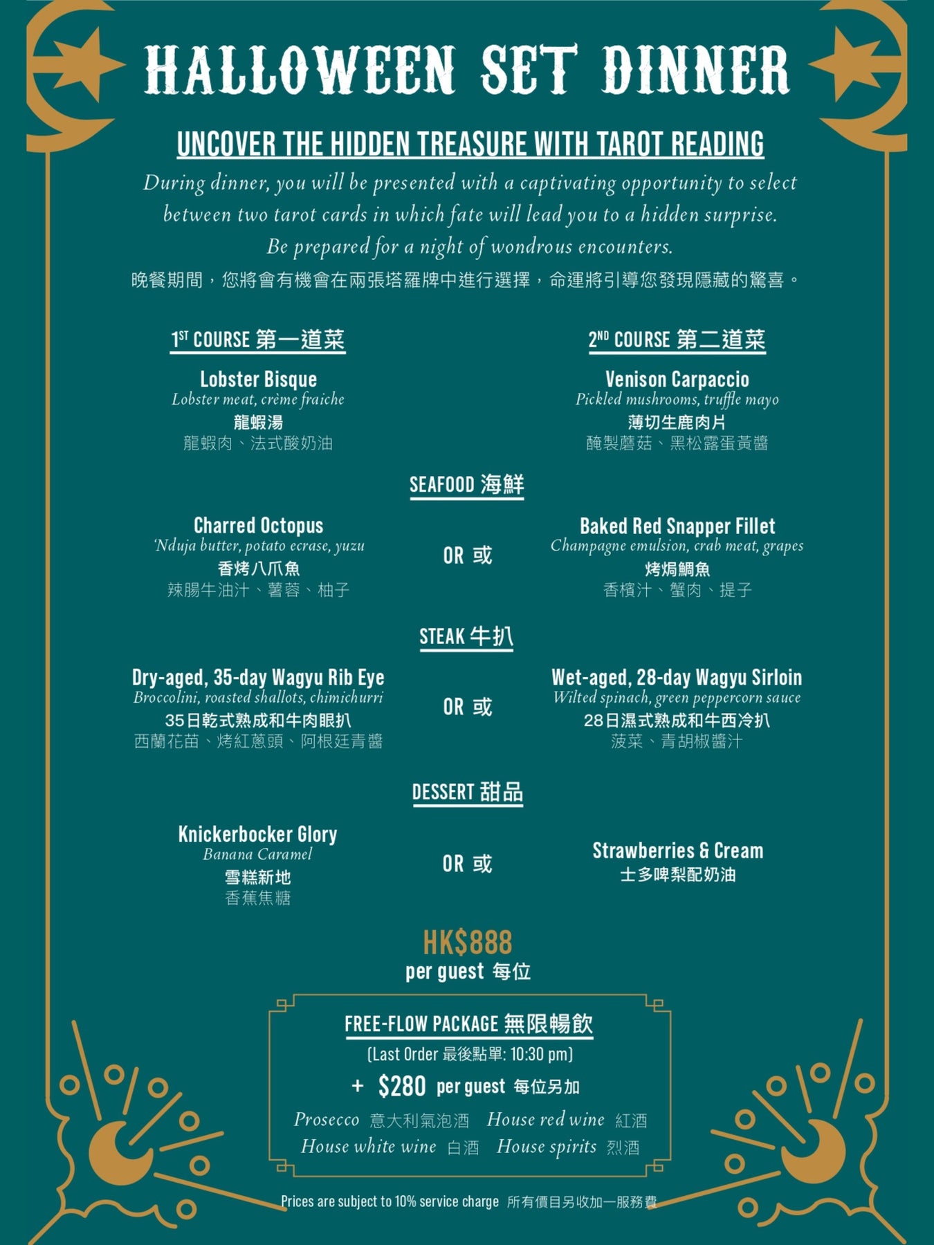 免費駐場塔羅牌占卜師: 晚上6時30分至9時30分*於10月22日或之前提前預訂並支付每位港幣200按金,可享晚餐八五折優惠。**所有價目均設收一服務費,並以原價計算。