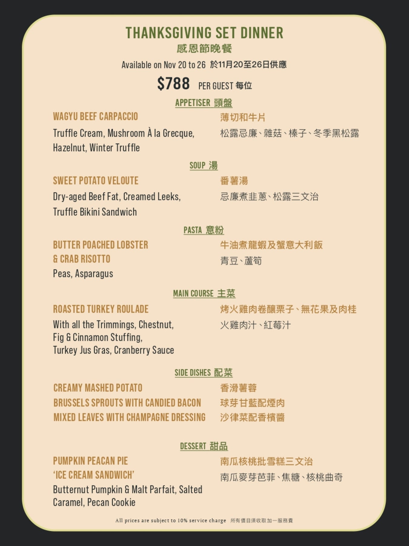 今年的感恩節,精心設計了一款5道菜晚餐,當中包括龍蝦意大利飯及火雞卷,於11月20日至26日期間供應。